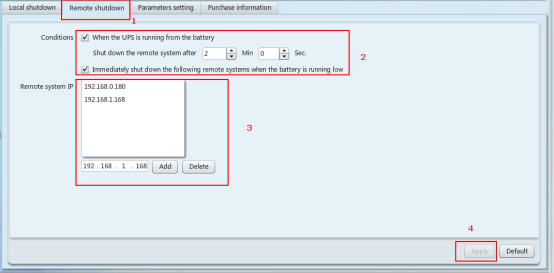 5. 交流電源關(guān)閉后,關(guān)機(jī)命令從192.168.0.175發(fā)送到192.168.0.180和192.168.1.168,然后自動(dòng)關(guān)機(jī),最后UPS關(guān)機(jī)。